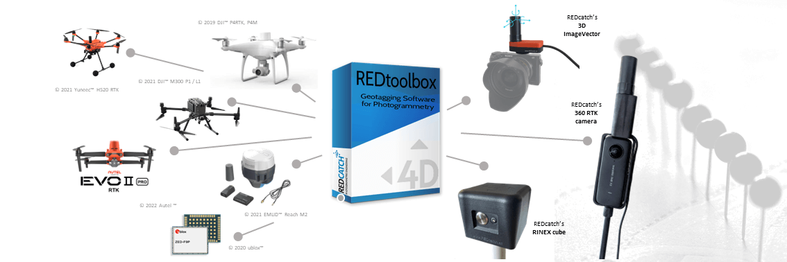 The software performs a multi-constellation (GPS, GLONASS, Beidou, Galileo) and multichannel (L1, L2, L5) GNSS postprocessing PPK of Base-Rover configurations. Such configurations can be found in many UAV / drone applications and terrestrial 3D ImageVector device